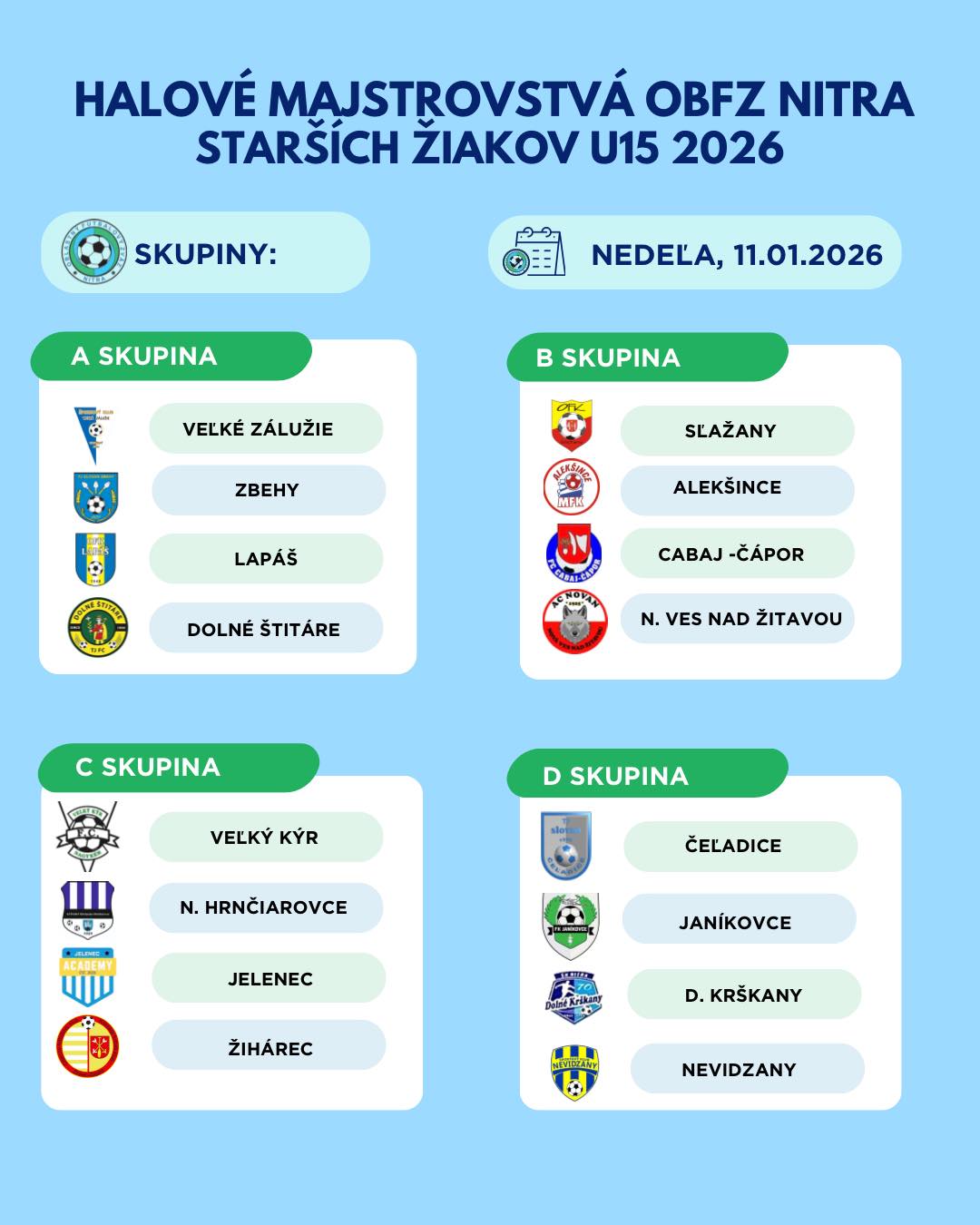 Halová futbalová sezóna pod hlavičkou Oblastného futbalového zväzu Nitra je v plnom prúde. Po úspešných turnajoch v kategóriách U9 a U13 pokračuje séria halových podujatí – Halovými majstrovstvami starších žiakov U15. Turnaj, ktorý sa uskutoční 11. januára 2026 (v nedeľu) v Mestskej športovej hale na Dolnočermánskej ulici v Nitre. Mladí futbalisti si zmerajú sily v štyroch skupinách, z ktorých najlepšie družstvá postúpia do vyraďovacej časti. Okrem boja o poháre a medaily čakajú na účastníkov aj individuálne ocenenia pre najlepšieho hráča, brankára a strelca turnaja a 5-členné all stars.